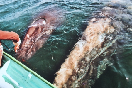Weltweit einmalig: Hier können Sie Wale streicheln. Und sie lieben es! Die gerade geborenen Walbabys sind so neugierig, daß sie alles beäugen wollen. Sie kommen zu Ihnen ans Boot, Mama natürlich nebenan.