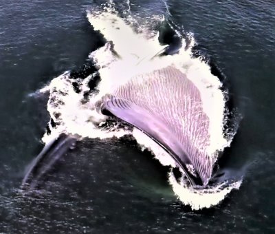 Ein einziger "Schluck" des Blauwals kann 60 bis 80 Tonnen Wasser und Futter enthalten, mehr als das Volumen seines Körpers. Daher nimmt der Wal nur Schwarmtiere vor seine Barten: Heringe, Makrelen, Krill, Sardinen. Lunge feeding ist eine außerordentlich effiziente Art zu jagen. Doch es muß sich schon lohnen, das Maul so weit aufzureißen: Kleinere Schwärme läßt der Wal links liegen.   (Im Bild sind Unterkiefer und Kehlsack rechts).