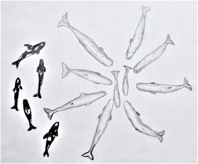 Forscher sahen fünf Killerwale auf eine kleine Gruppe Pottwale mit ihrem Nachwuchs zuschwimmen. Diese Pottwale mussten sofort Alarm geschlagen haben, denn augenblicklich gesellten sich weitere Artgenossen zu ihnen. Gemeinsam bildeten sie einen Kreis (Zeichnung oben), manche mit dem Kopf über Wasser, andere schlugen mit den Schwanzflossen auf die Wasseroberfläche, als wollten sie ihre Stärke demonstrieren.