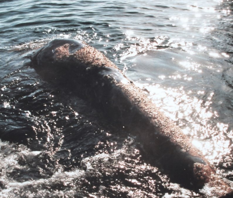 Zweitens haben die Grauwale eine besondere Fresstechnik. Sie pflügen am Boden entlang – Maul weit auf und immer auf der rechten Seite. Sie saugen das Sediment durch ihre kurzen Barten ein und filtern so Bodentiere heraus. Das wird auch der Grund sein, warum ihre Schnauzen mit Seepocken bedeckt sind (Bild unten). In den flachen Lagunen der Baja California sieht man oft, wie nur eine Brustflosse aus dem Wasser ragt und sich vorwärts hin und her bewegt: Der Wal frisst eine karge Mahlzeit.