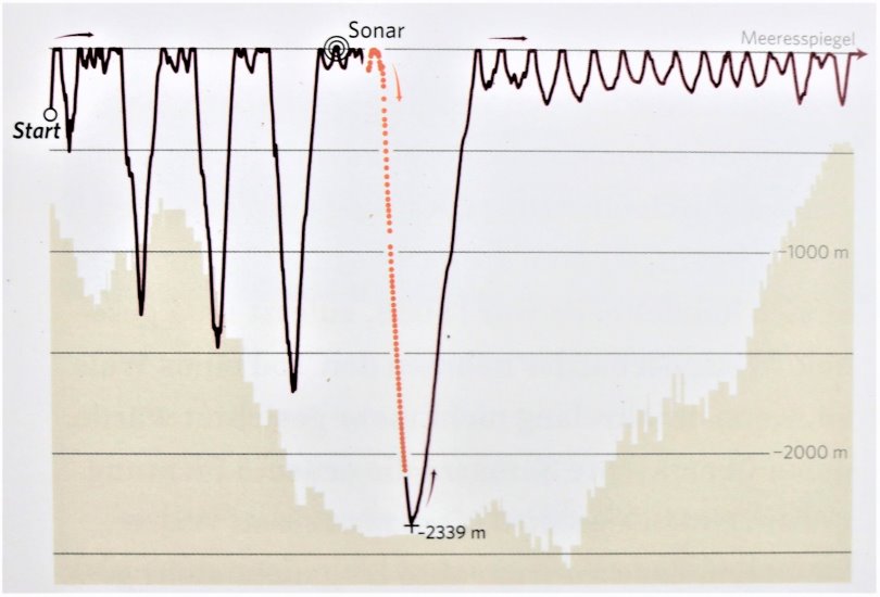 Profil des Meeresbodens; rot gepunktet der Fluchttauchgang