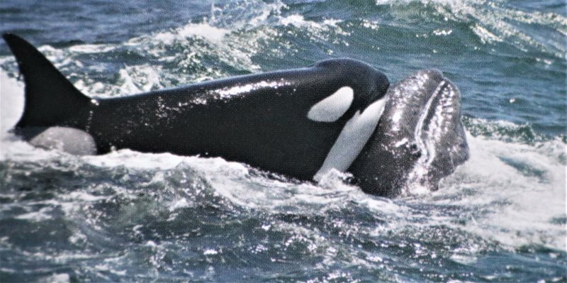Aber sie tragen ihren Namen zu Recht: Killerwale sind die einzigen Tiere, die einen Wal töten können. Vor allem die Jungen, seltener auch Erwachsene.