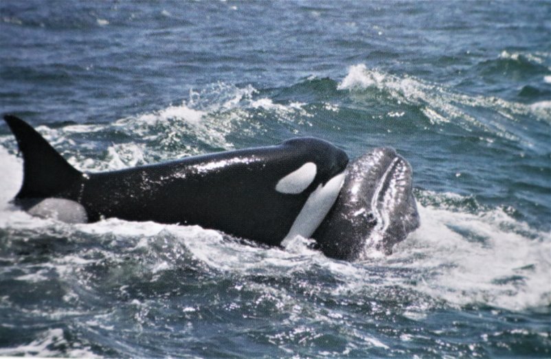 The killer whale nuckles the blowhole of a gray whale calv, in order to prevent it from breathing.